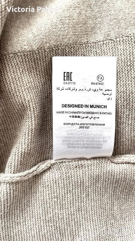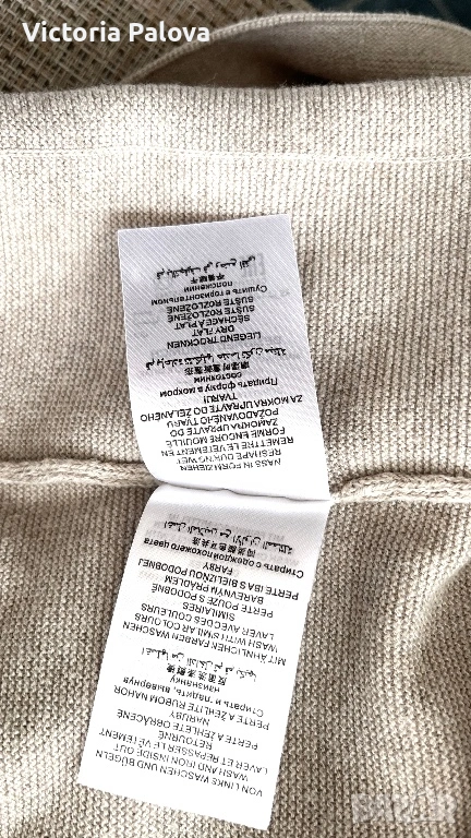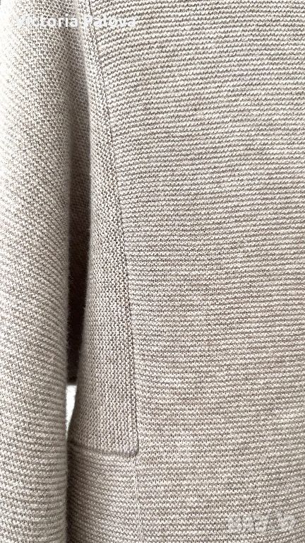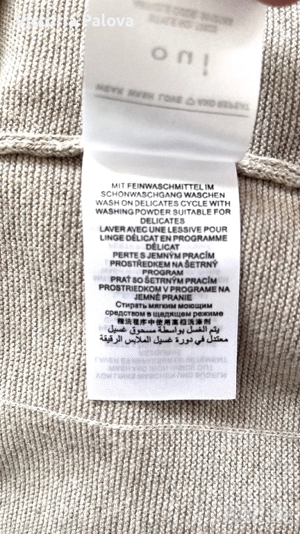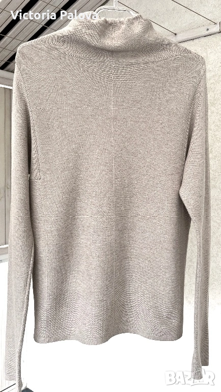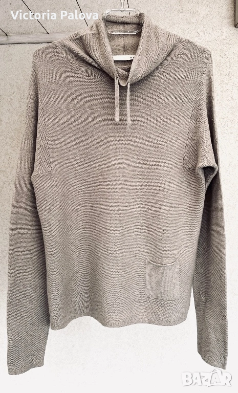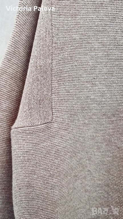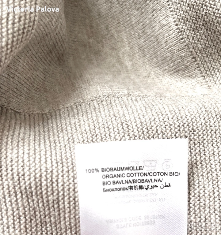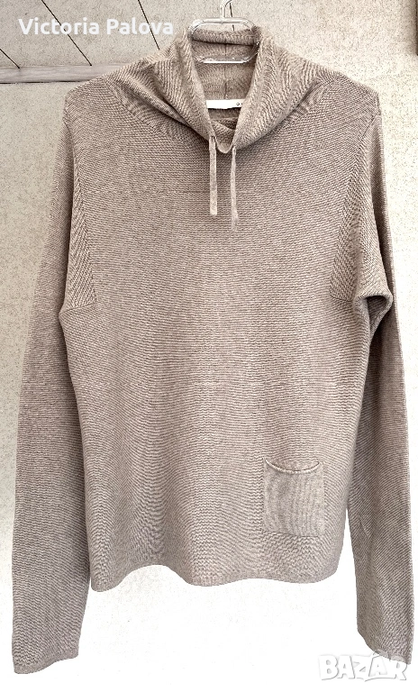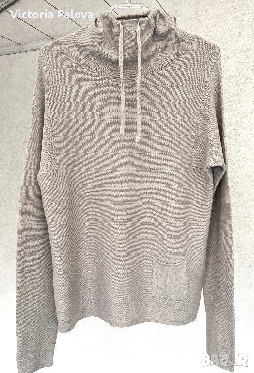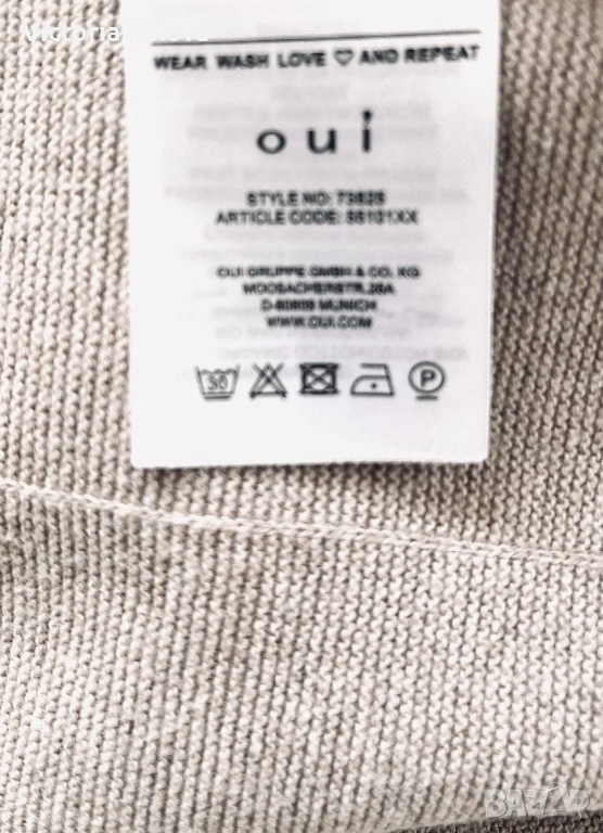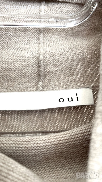 Изискан пуловер ( блуза) от престижна скъпа немска марка OUI - перфектното съчетание на комфорт, стил, устойчивост. Органичен памук ( BIO BAUMWOOLE), мека дишаща текстура с фина плетена структура, нежна към кожата, разтеглива и екологична. Неутрален бежов цвят ( тауп), висок cowl neck с връзка за регулиране, дълги ръкави, джобче. Особеност на марката OUI е уникалният ъглов шев на ръкавите - прав ъгъл ( 90 градуса) в зоната на рамото вместо стандартния - отличителен дизайн, който не се среща при други марки - вдъхновен от мюнхенската knit експертиза от 1972г. ГО - 52см, дължина - 64см.