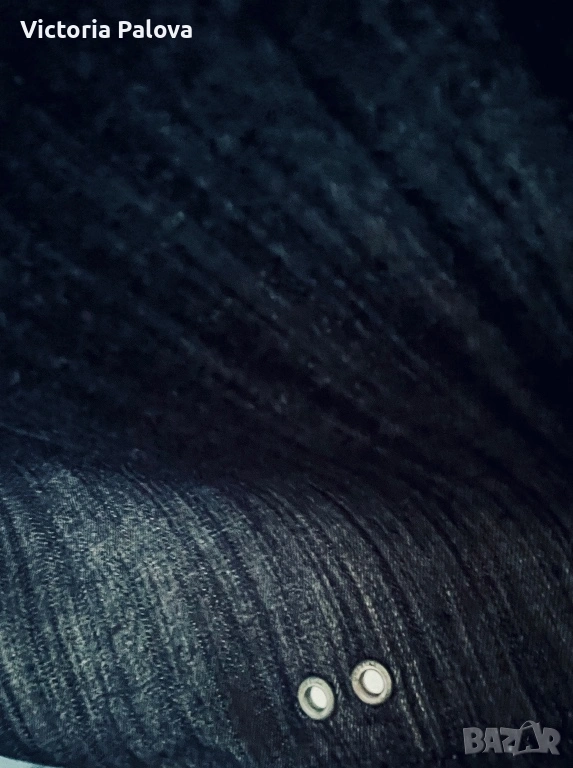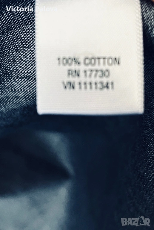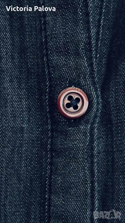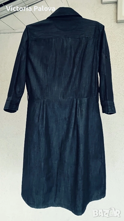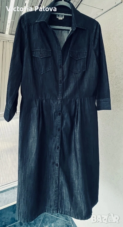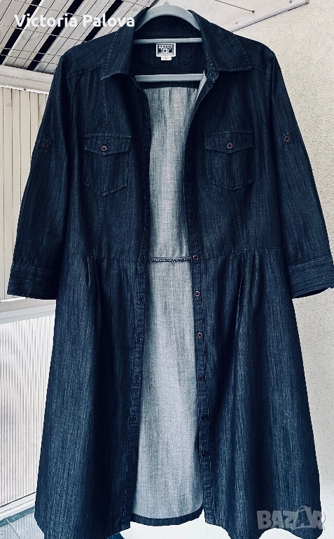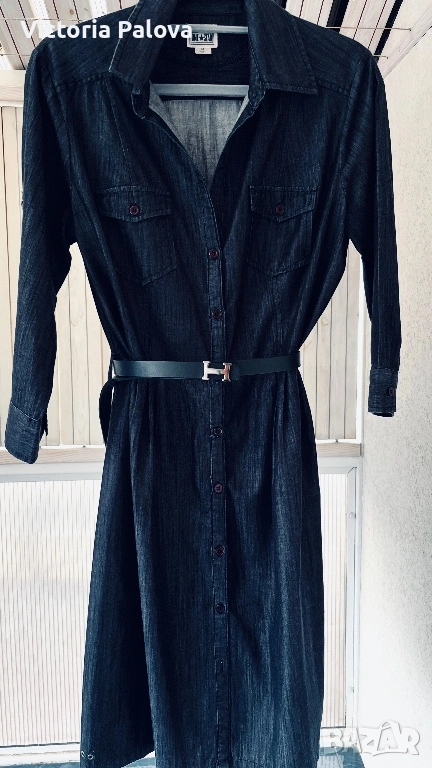 Роклята е прекрасно съчетание на casual стил и комфорт. Качествен тънък тъмносин деним , 100% памук, ( made in India), размер М. Класическа риза-кройка с яка, копчета по цялата дължина, гръдни джобове с копчета и дълги ръкави, които могат да се навиват. Долната част е леко разкроена с плисета за женствен силует, а коланът на снимката е само за демонстрация ( има опция за стилизиране с колан за по- елегантен вид). Това е универсален модел, подходящ за ежедневни визии с кецове или по- стилни комбинации с ботуши, клинове, дънки или като самостоятелно като рокля. Рамо - 43см, ГО - 54см, талия - 44см, дължина - 98см,