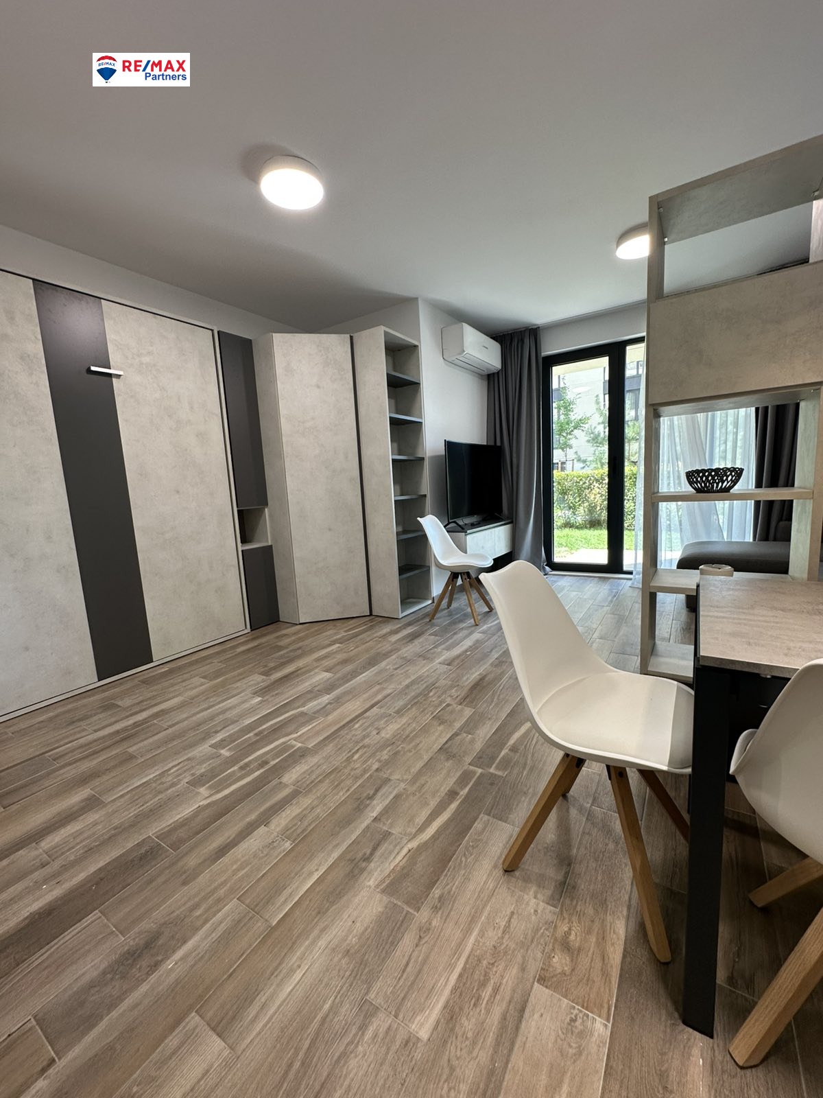 Състои от антре, просторна всекидневна с кухненска част и вградено двойно падащо легло. Към апартмента има прилежащата озеленена тераса, като е описана с обликационно право на ползване в нотариалния акт.