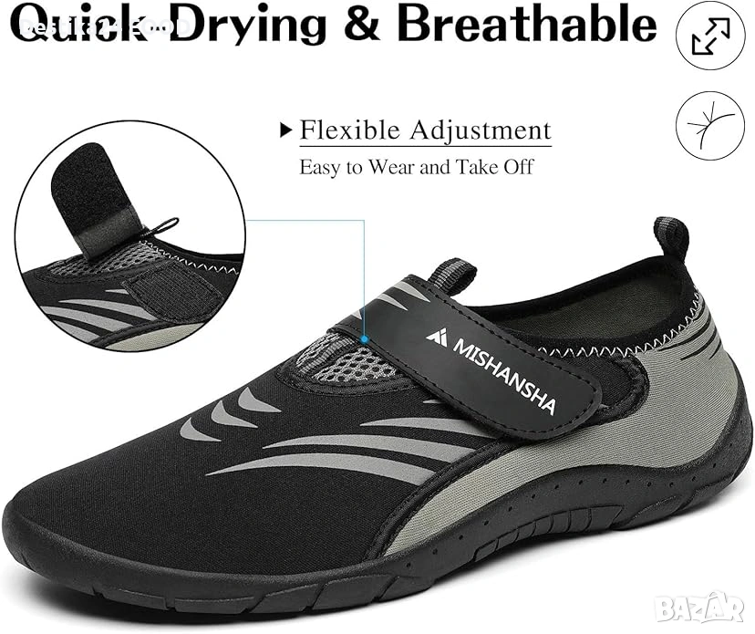 Продавам унисекс водни обувки Mishansha, подходящи за плаж, море, река, басейн, аквапарк, сърф, рафтинг и други водни и outdoor активности. Леки, удобни и бързосъхнещи, осигуряват отлична защита и стабилност.