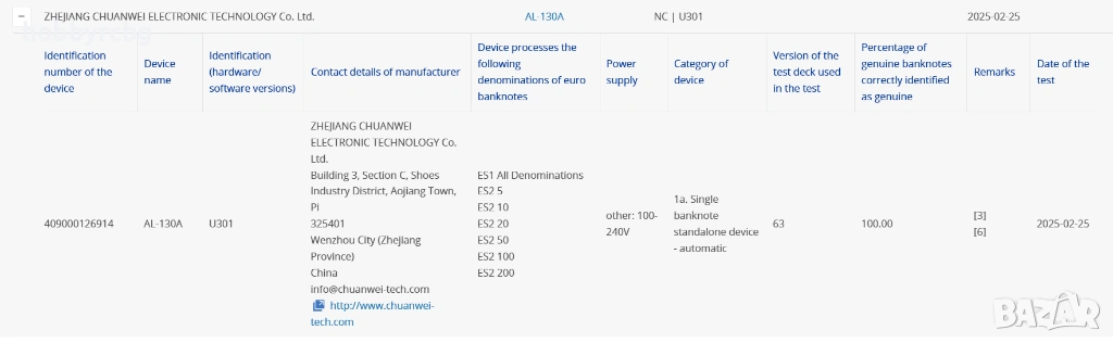 Детектор на фалшиви банкноти AL-130A e произведен от завод Chuanwei и