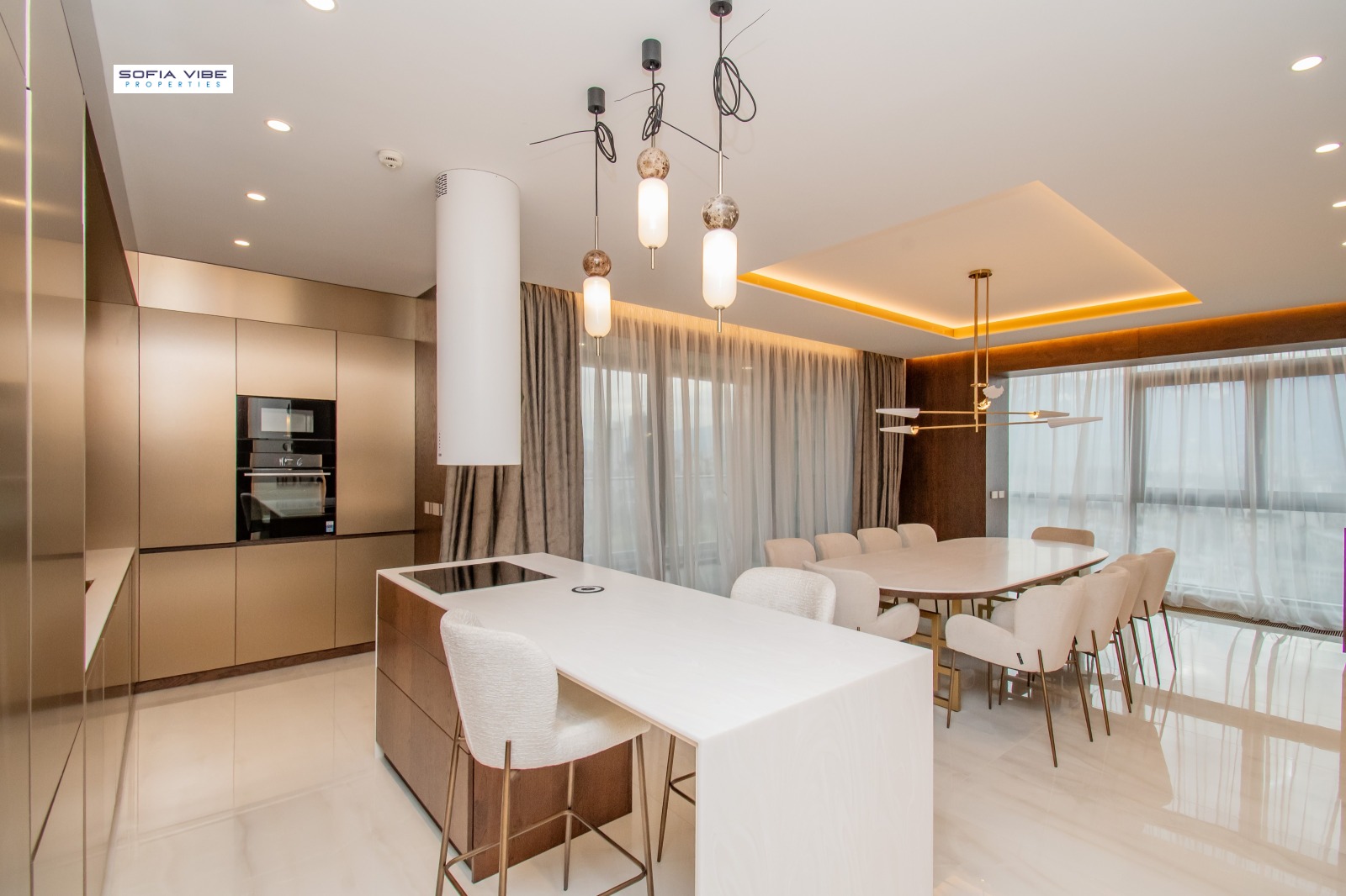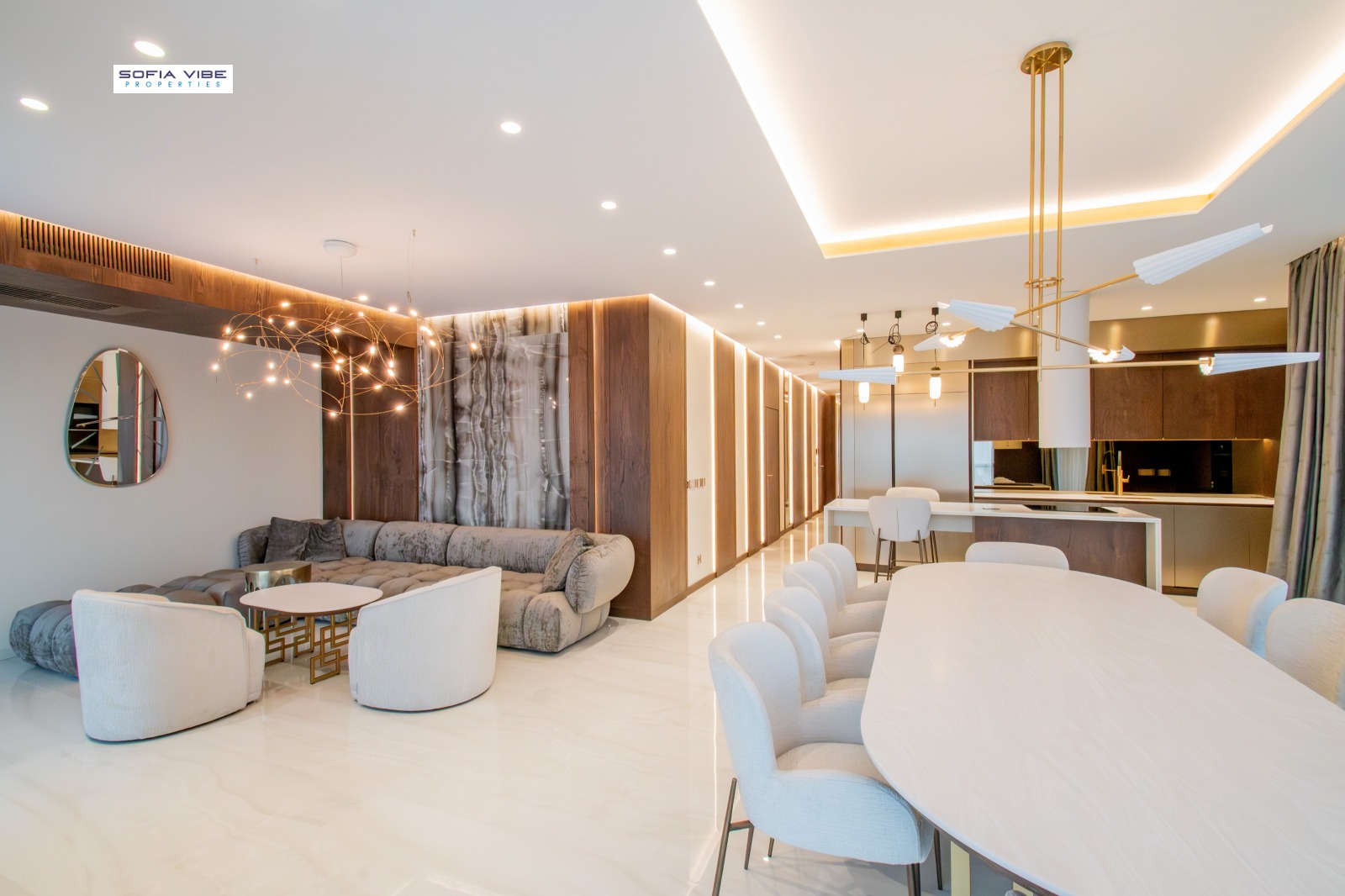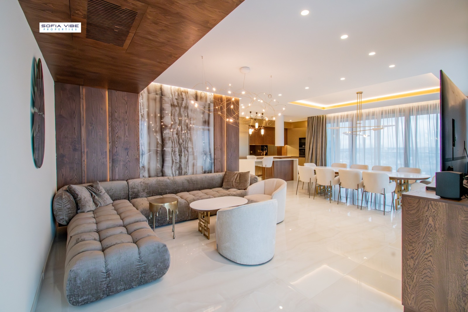 The property is situated on a high floor of the residential tower, with a limited number of apartments per floor, providing a calm living environment, controlled security, and open panoramic views of the city and Vitosha Mountain.