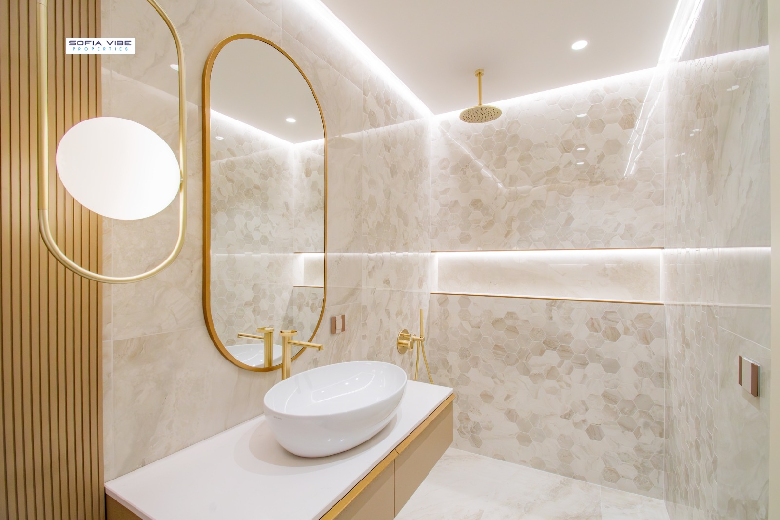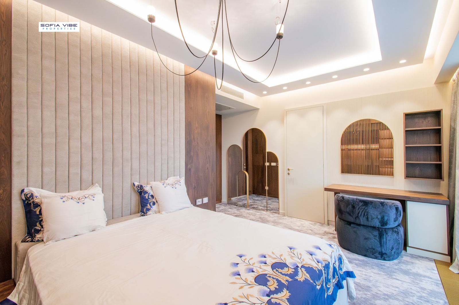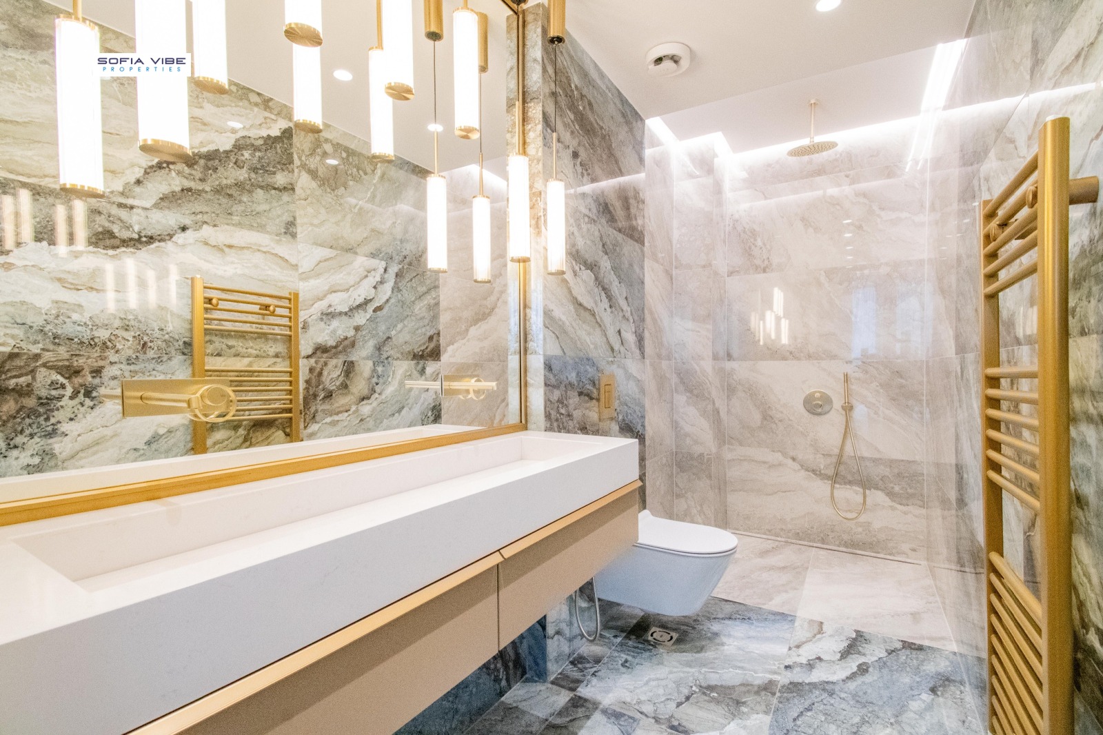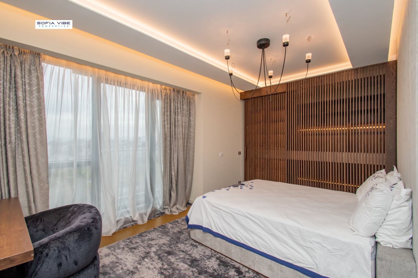 The property is situated on a high floor of the residential tower, with a limited number of apartments per floor, providing a calm living environment, controlled security, and open panoramic views of the city and Vitosha Mountain.