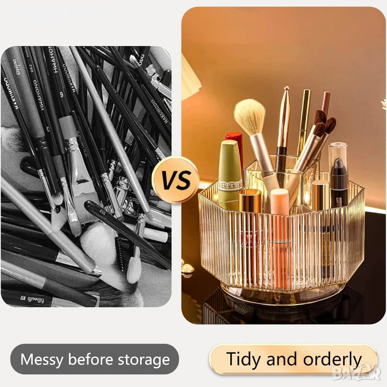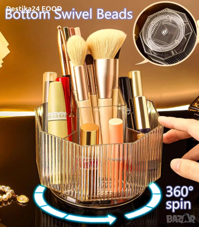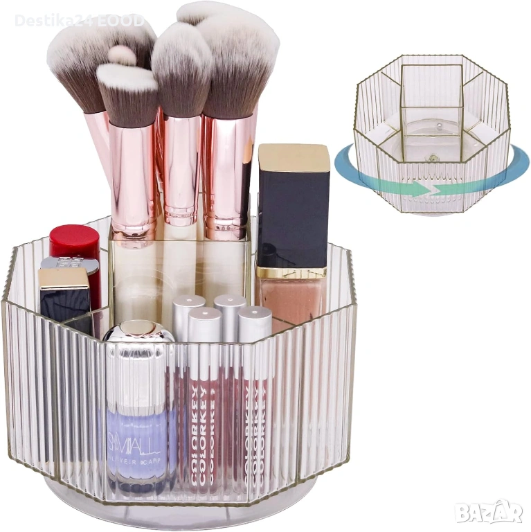 Продавам въртящ се органайзер за грим на 360°, подходящ за съхранение на козметика, четки за грим и аксесоари. Практичен и стилен, с голям капацитет и изчистен дизайн, който поддържа тоалетката или бюрото подредени.