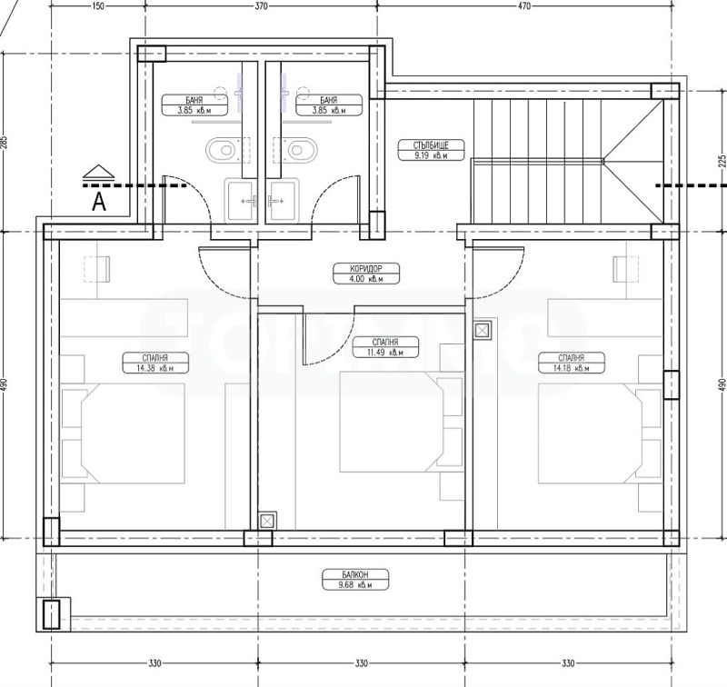 Втори етаж: коридор, родителска спалня 14.4 кв.м. със собствен санитарен възел, втора спалня 11.5 кв.м., трета спалня 14.2 кв.м., втори санитарен възел на етажа, трите стаи с излаз на тераса.