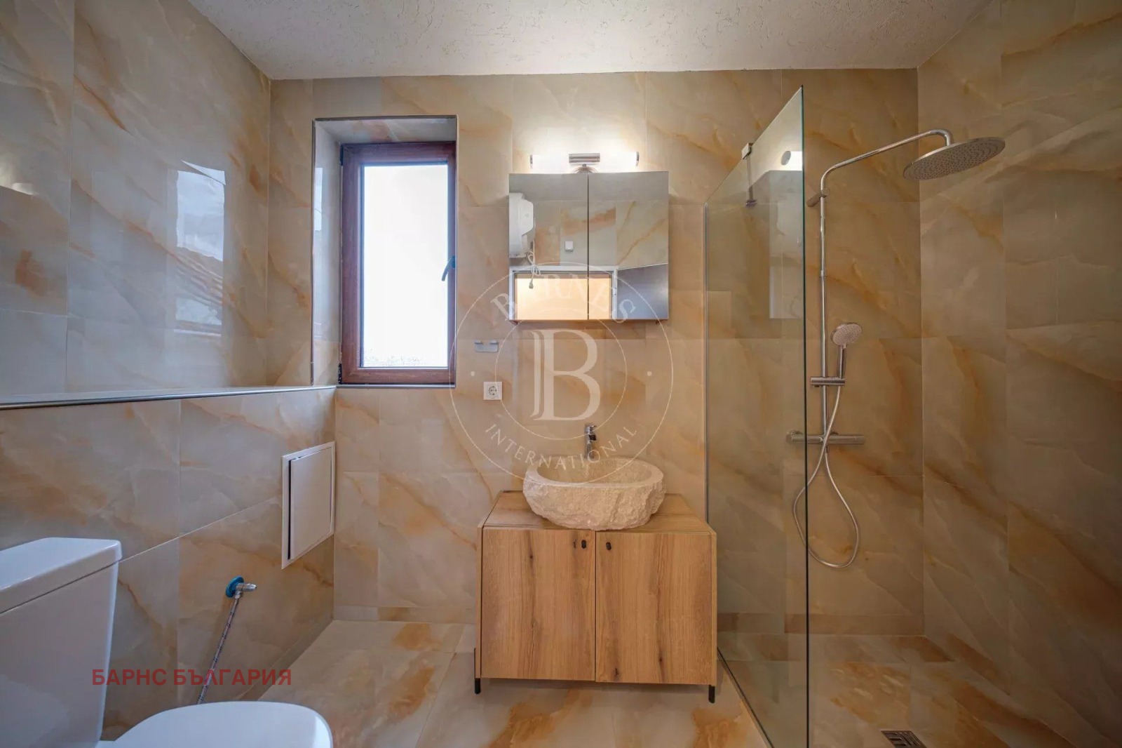 • Баня с тоалетна с прозорец, мивка с горен и долен шкаф, бойлер, душ параван с термосмесител, пита и подвижен душ.