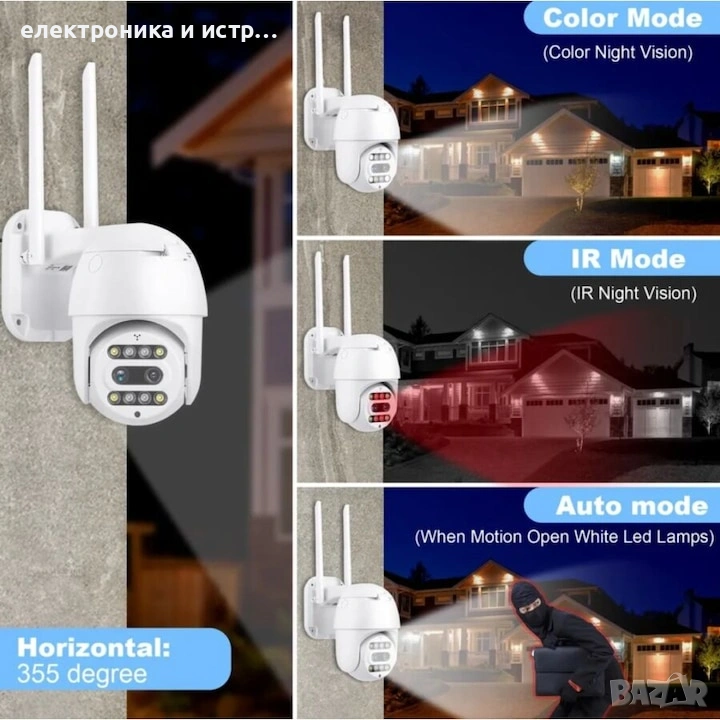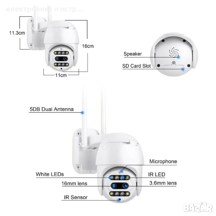 Подходяща е както за дневно, така и за нощно наблюдение, а с помощта на вградените си микрофон и високоговорител можете да говорите с човека от другата страна на камерата - благодарение на водоустойчивия й корпус можете да я инсталирате както на открито, така и на закрито. Благодарение на HD качеството и вградените светодиоди можете да получавате ясни и резки записи през деня и през нощта. Водоустойчивата камера поддържа Wi-Fi връзка, благодарение на която можете лесно да следите изображението й от мобилен телефон и да я настроите да ви изпраща алармата, когато засече движение.