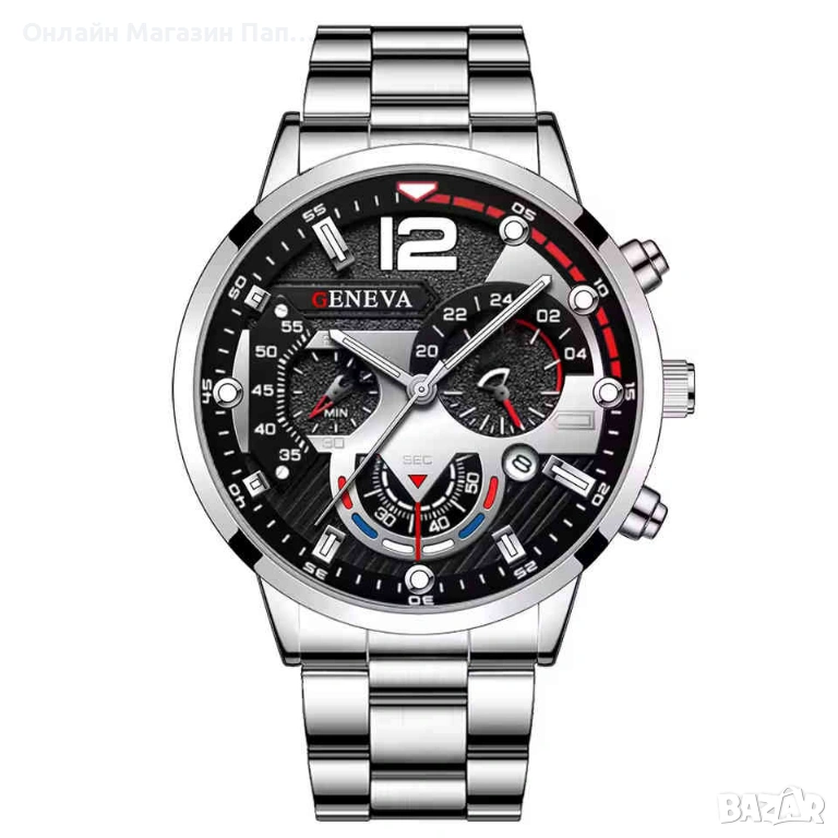 Часовникът работи с надежден кварцов механизъм, осигуряващ точно отчитане на времето. Календарната функция е практично допълнение, а допълнителните бутони и подциферблати са само декоративни.