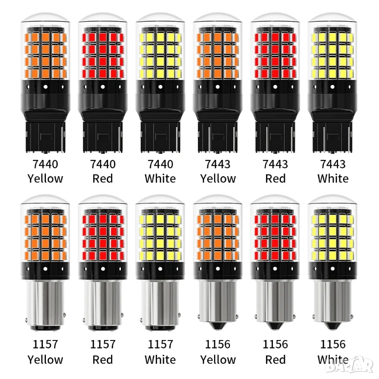 Комплектът включва 2 броя високоефективни LED крушки с цокъл BAU15S/PY21W, в ярък кехлибарено-жълт цвят. Тези крушки са специално проектирани за автомобилни мигачи, стопове, светлини за заден ход или дневни светлини. Изградени са с 54 мощни SMD светодиода, които произвеждат ослепителна светлина от 3000 люмена, осигурявайки отлична видимост и безопасност. Корпусът е от авиационен алуминий за оптимално пасивно охлаждане, а степента на защита IP67 ги прави напълно водоустойчиви и прахоустойчиви, издържайки на температури от -40°C до +80°C. С живот от над 80 000 часа те са много надеждна и дълготрайна алтернатива на обикновените крушки, подходящи за автомобили, мотоциклети, камиони и ATV.