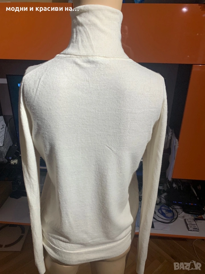 2. Второто поло е на бранда UNIQLO в цвят слонова кост. То стои по-прибрано по тялото, с типичната поло яка, която се навива. Изработено от изключително фина вълна.