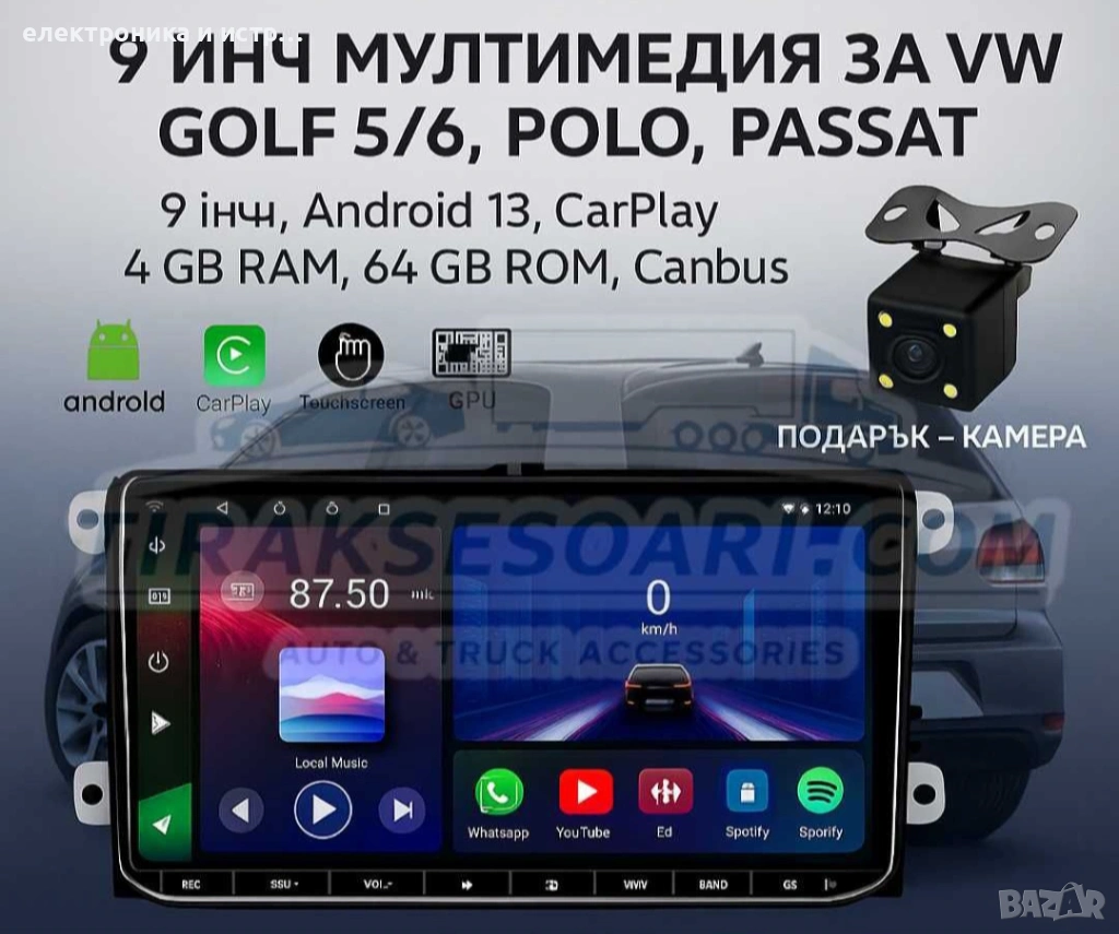 9 инч Мултимедия за VW Golf 5/6, Polo, Passat, Touran с Android 13, CarPlay, 4GB RAM, 64GB ROM