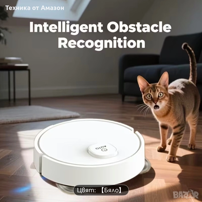 Робот прахосмукачка 3 в 1, 16x16x6см, с моп, автоматично зареждане, Wi-Fi/Приложение, бял