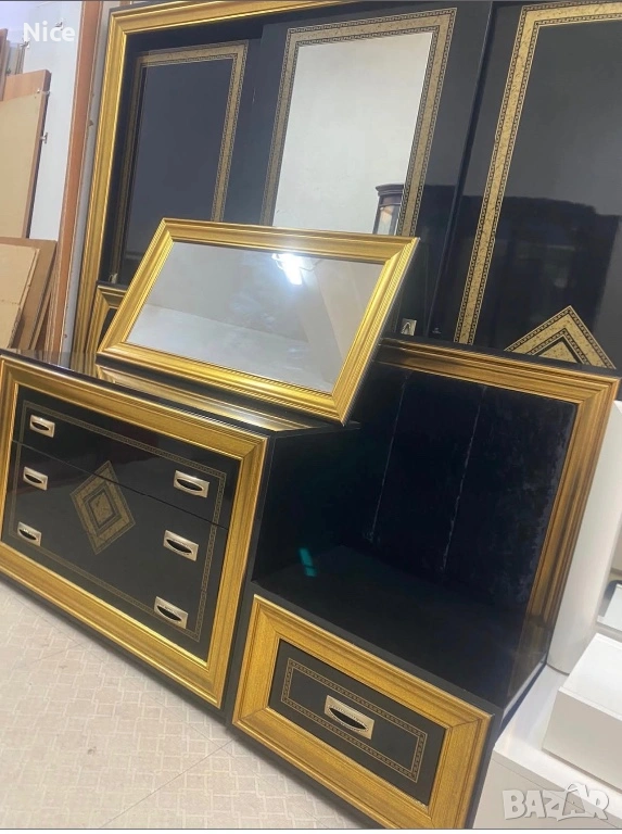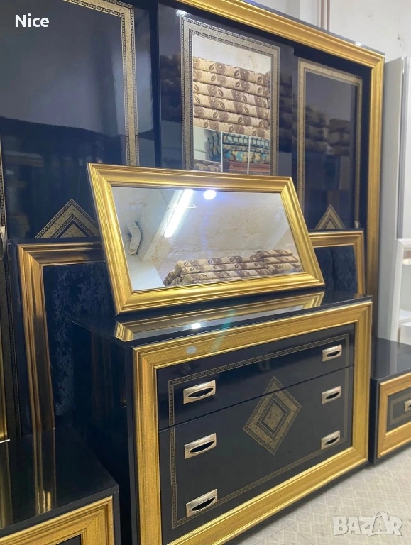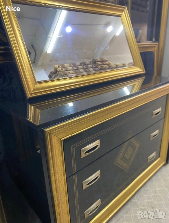 Този луксозен италиански спален комплект се отличава с безспорно качество. Състои се от елегантни мебели с черна основа и златисти декоративни елементи, които придават изискан и стилен вид на спалнята. Комплектът включва шкаф с чекмеджета и огледало в златна рамка, които ще добавят завършен вид към всяка спалня.