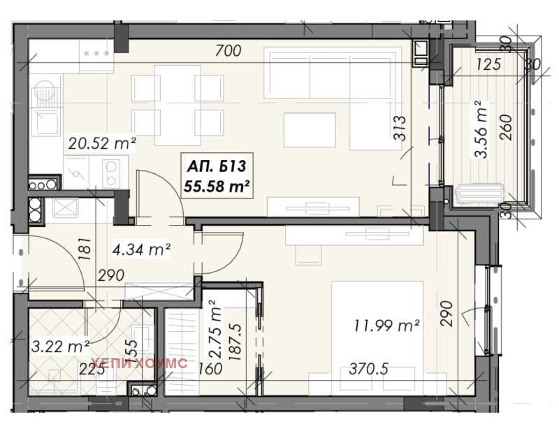 Апартамента се намира на четвърти етаж от шест и е с площ 65.07 кв. м. от които 55.58 кв. м. чиста и е със следното разпределение: