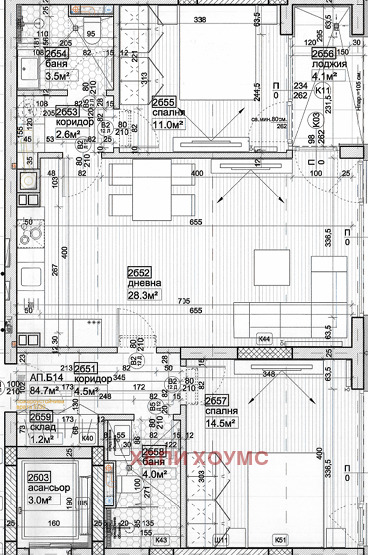Апартаментът е разположен на втори етаж с източно изложение и чиста площ от 84.7 кв. м. разпределена в: