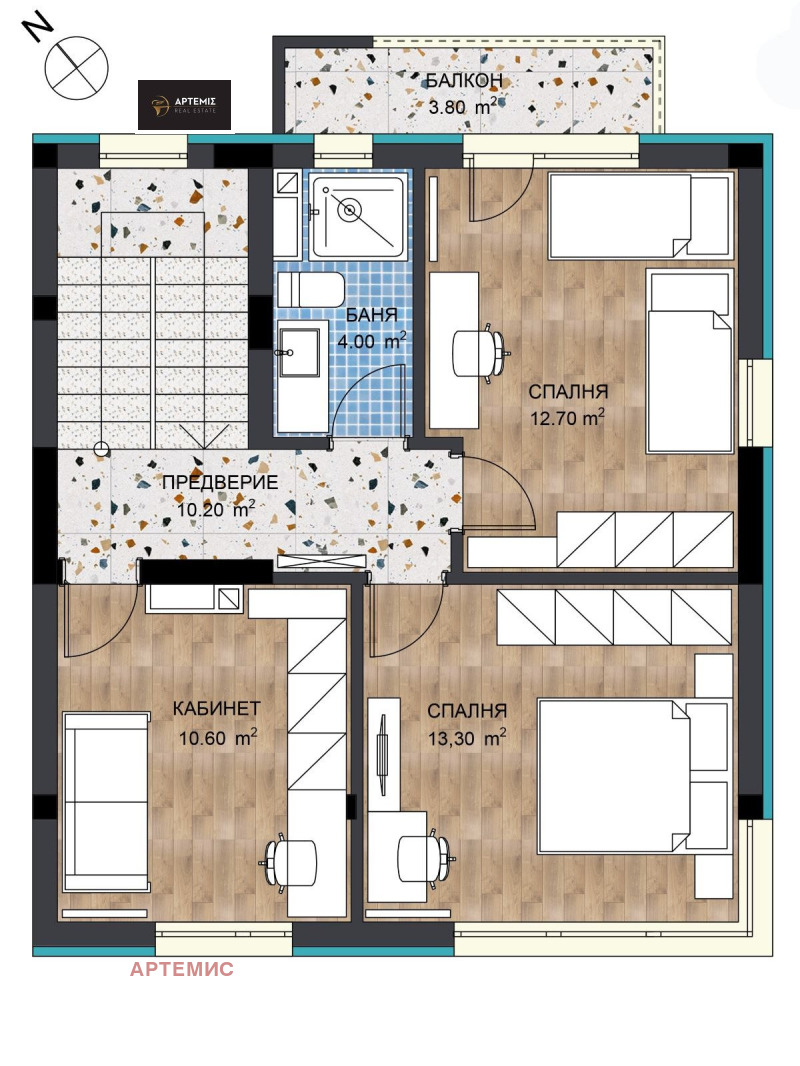 Втори етаж - три спални, баня с тоалетна, тераса;