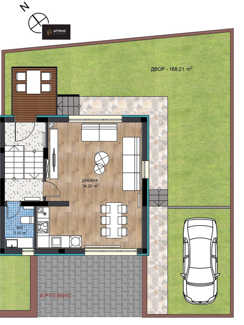Първи етаж - дневна с кухненски бокс, тоалетна, веранда;