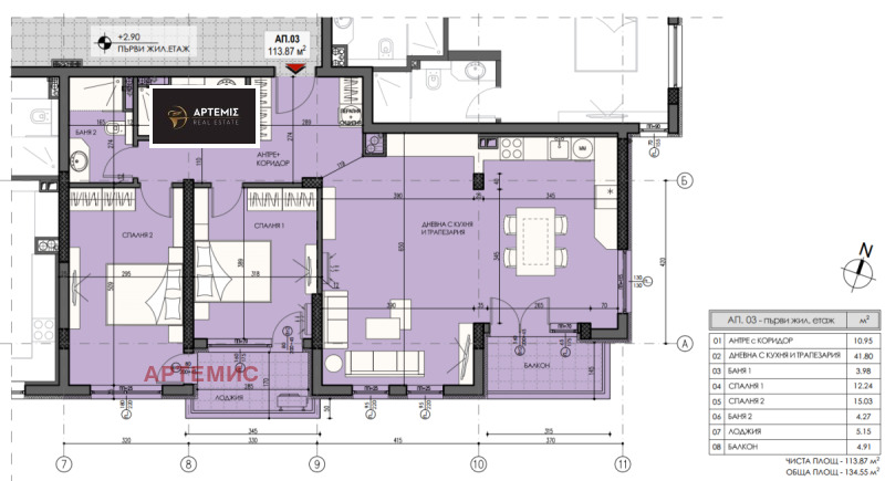 Има следното разположение: дневна с кухня и трапезария- 41.80 кв.м.; две спални - по 12.24 и 15 кв.м.; две бани; антре с коридор; лоджия и балкон.