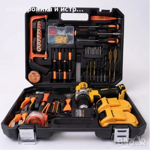 Ударно пробивен акумулаторен винтоверт в комплект с инструменти от първа необходимост .