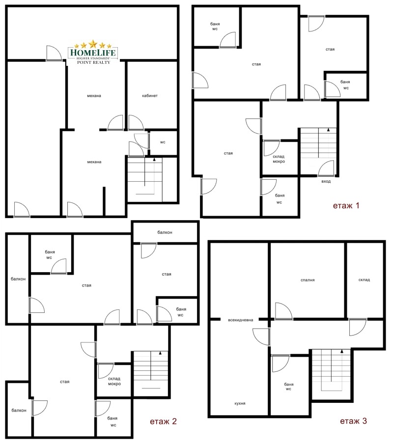Сутерен: Вход към къщата, просторна дневна за гости, кухненски кът, рецепция /офис/, тоалетна, складови помещения, сервизно помещение.