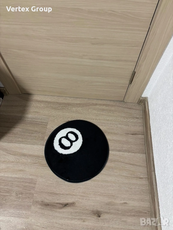 Кръгъл килим с черен фон и бял символ на осмица. Подходящ за украса на дома или офиса. Сравнително малък, но е идеален за декор вкъщи. 50х50 см