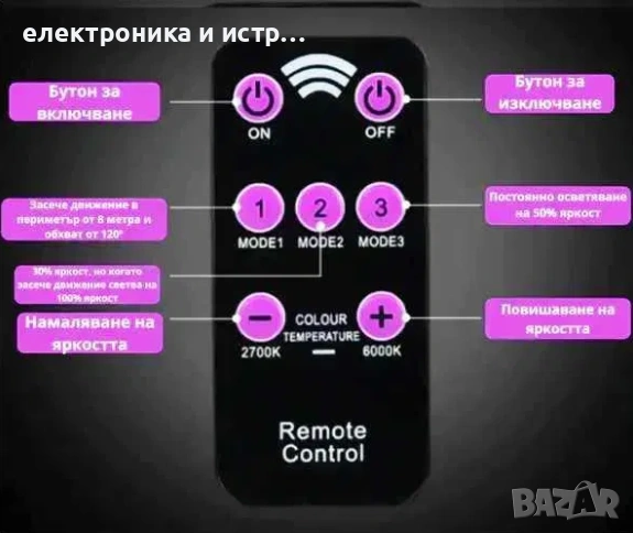 - РЕЖИМ 1: Когато засече движение светва ярко за 30 секунди и се изклюва
