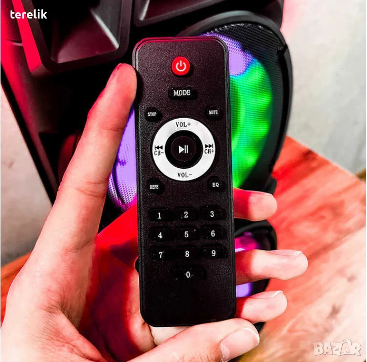 Преносимата колона е с мощност 120W и вградени 2 микрофона. Работи с 6500mah батерия, подходяща за караоке по розентка или на пикник.
