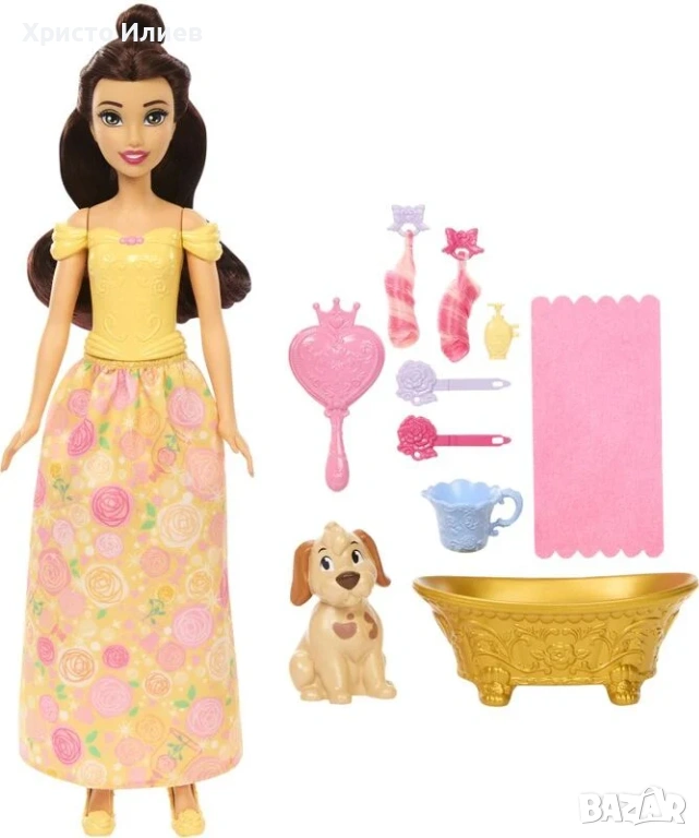 Този комплект от Disney Princess вдъхновява забавленията по време на баня с куклата Бел и нейното очарователно кученце Султан. Децата могат да помогнат на куклата Бел да изкъпе Султан във ваната. Добавете вода, за да видите как фигурата на кученцето разкрива забавна изненада с промяна на цвета! Куклата Бел се отличава с излят корсаж, мека пола и подходяща корона и обувки.