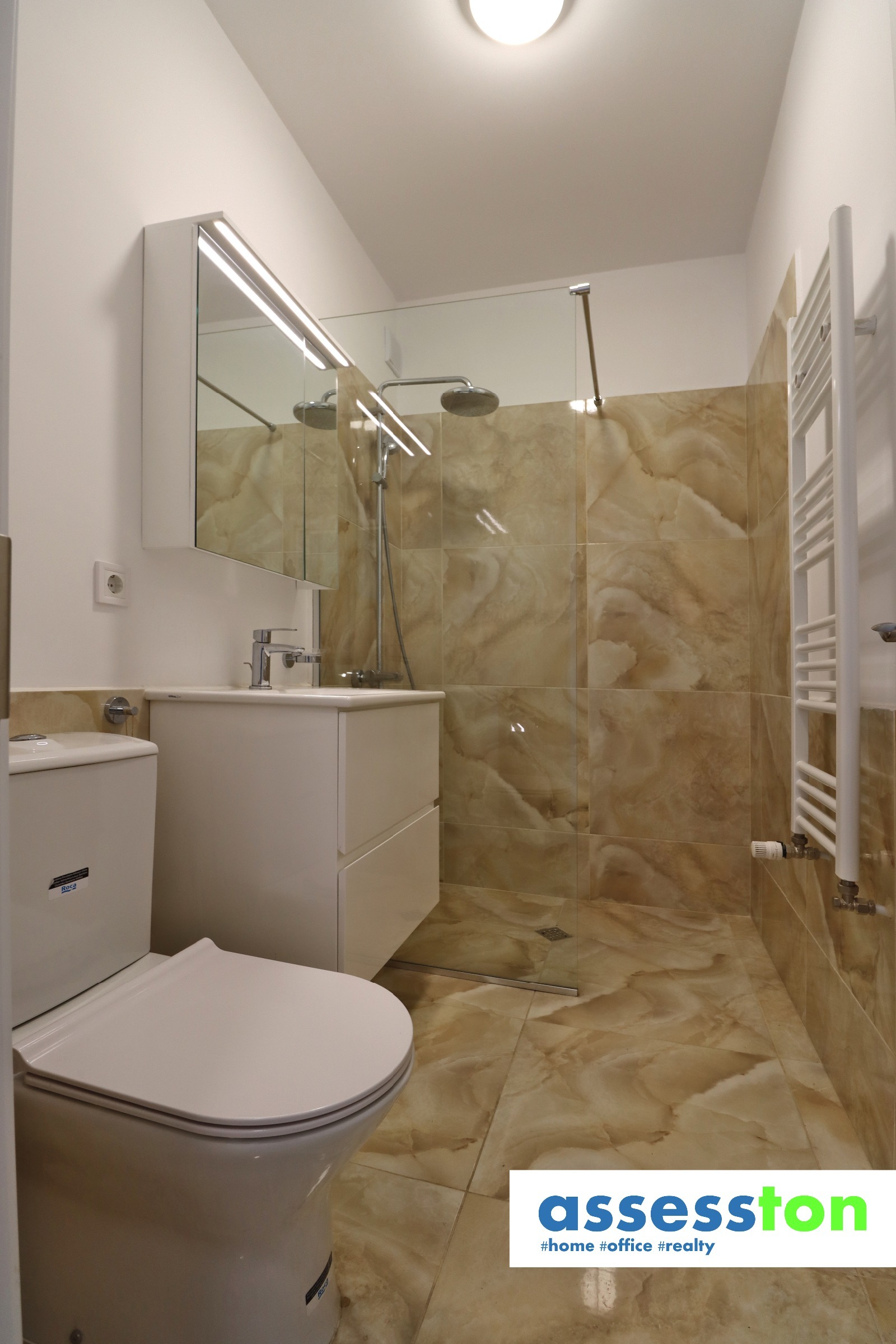 Баня с душ зона, мебели за баня от ViCard, таванно и допълнително LED-осветление с противовлагова защита, вградена тоалетна структура.