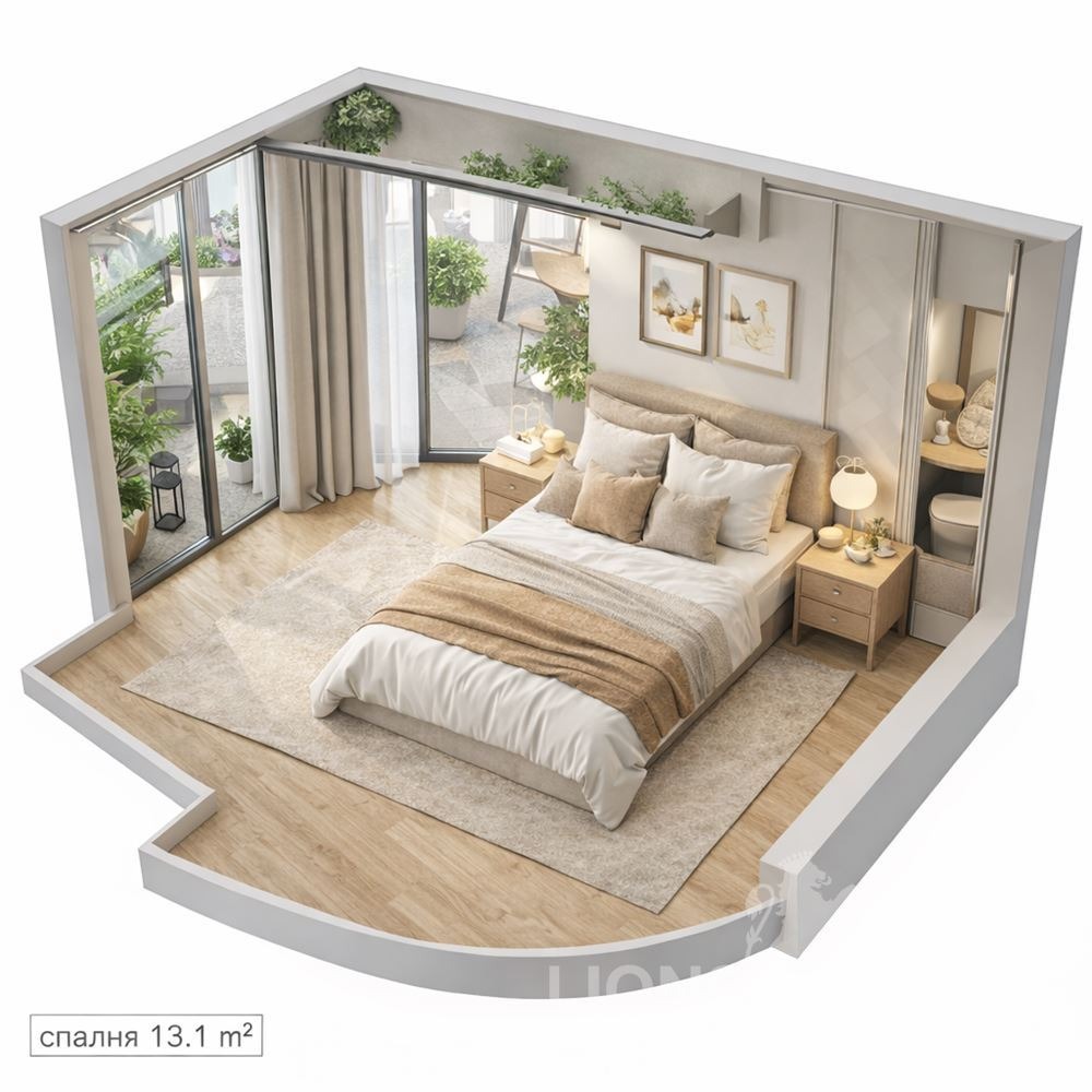 Имотът се състои от входно антре, баня с тоалетна, две спални и дневна с кухненски бокс. Подходящ е, както за инвестиция, така и за отдаване под наем. Има възможност за закупуване на подземно паркомясто. Благоприятно югозападно изложение. Площта на жилището е 81кв.м, 1480 /кв.м.