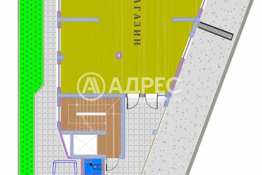 Магазин, разположен на кота 0.00, със застроена площ 130,99 кв.м. Обектът се намира на партерно ниво на сградата и включва търговска зала, складово помещение и сервизни помещения. Достъпът до магазина е директен от улично ниво, чрез самостоятелен вход, осигуряващ удобство за посетители и товаро-разтоварни дейности. Фасадното остъкление позволява добра видимост към търговската площ. Обектът е подходящ за развиване на търговска дейност, офис, студио за услуги или друг вид обслужващи функции.