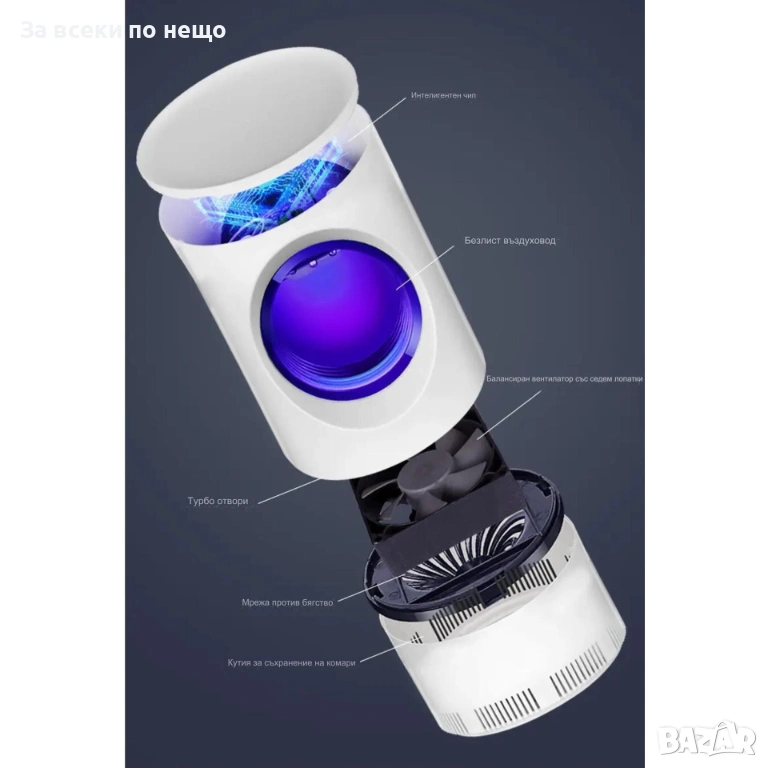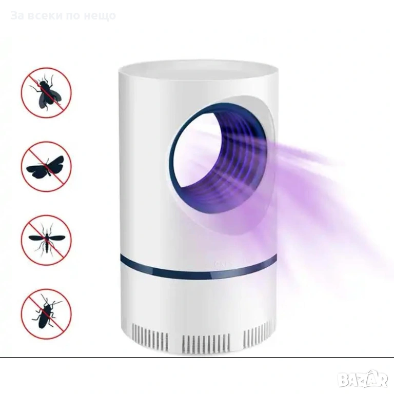 Лампа против комари с 368nm светлина - Използването на любимата на комарите 368nm ултравиолетова лампа за улов на комари, 360° светлина и фотокаталитична реакция, произведена от фотокатализатора, освобождава въглероден диоксид и въздушен поток, за да симулира влажната атмосфера на въглероден диоксид, излъчвана от човешкото тяло. Привлича комари във всяка посока.