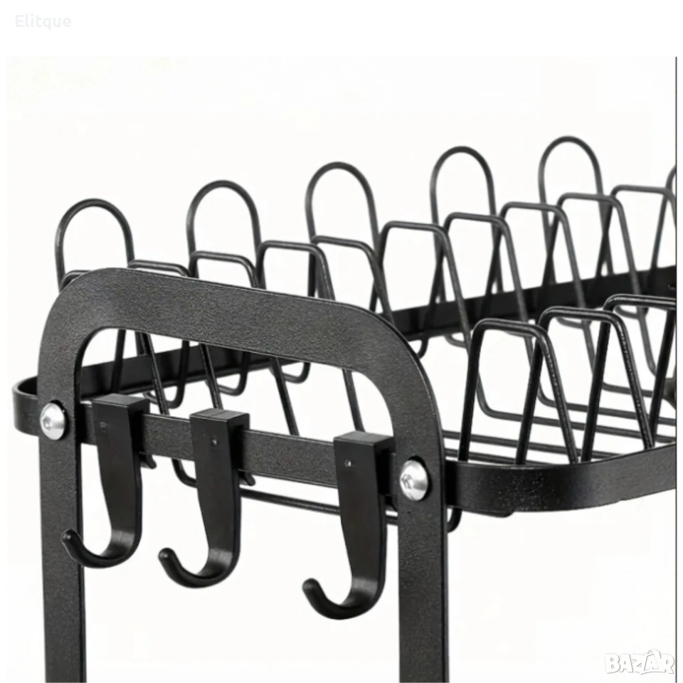 Технически характеристики: Материал: стомана и здрава пластмаса; Цвят: черен; Размери: Височина: 32 см; Широчина: 42 см; Дълбочина: 30 см; Система за оттичане на водата; Двупластова вертикална конструкция. Какво ще получите: Двупластова XXL поставка за съдове; Подложка за оттичане на водата; Контейнер за прибори; Поставка за дъска за рязане; Транспортна опаковка.