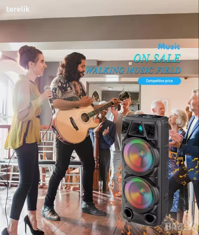 Преносимата колона е с мощност 120W и вградени 2 микрофона. Работи с 6500mah батерия, подходяща за караоке по розентка или на пикник.