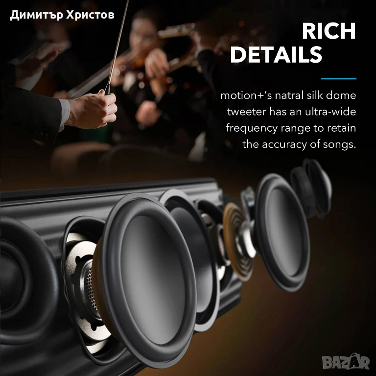 Масивен и плътен звук с интензивен бас снабден с два ултра високочестотни пищялки, неодимови високоговорители и пасивни радиатори, за да изпълни всеки ъгъл на стаята ви с 30 W богат звук. Ниските честоти се подобряват в реално време чрез нашата изключителна технология bassuptm.