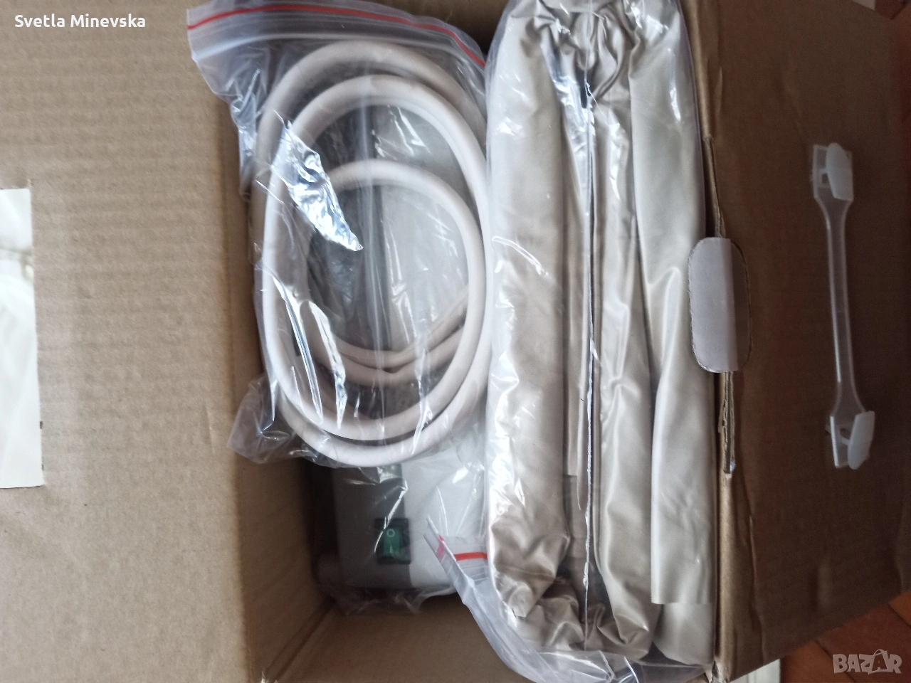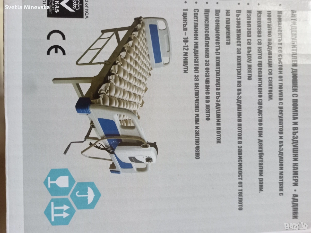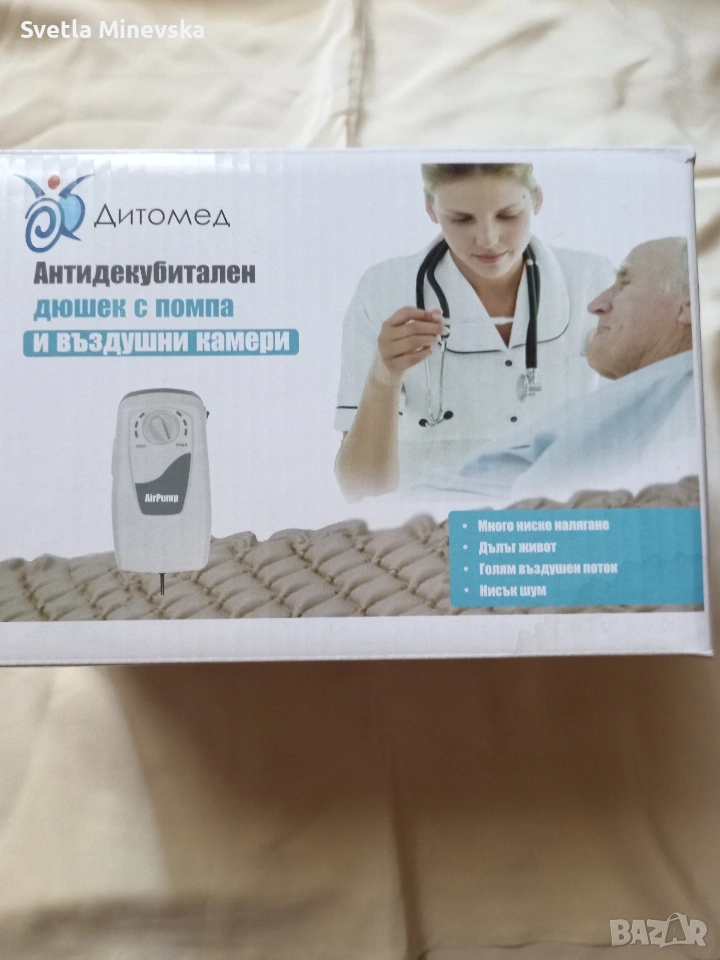 Антидекубитален дюшек с електрически помпа. Използван е една седмица, след което е старателно измит и дезинфекциран. Всичко работи перфектно по него.