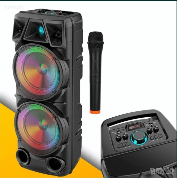 Преносимата колона е с мощност 120W и вградени 2 микрофона. Работи с 6500mah батерия, подходяща за караоке по розентка или на пикник.