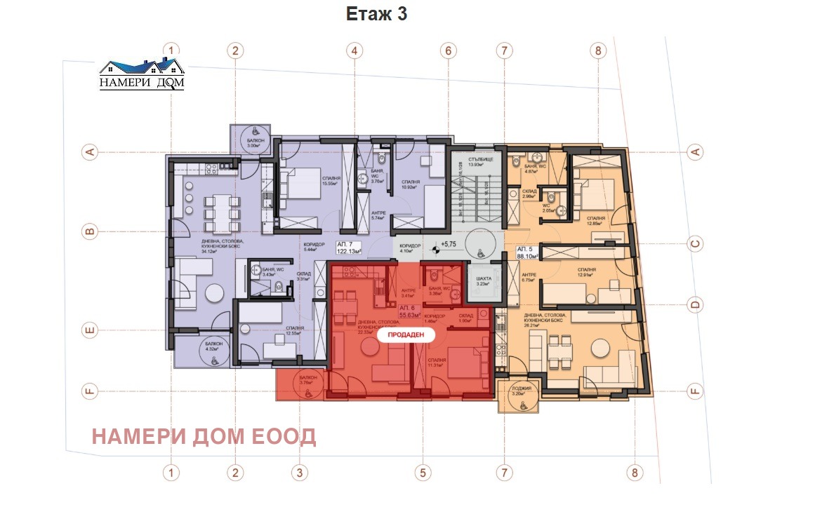 Ап.5 е тристаен на ет.3 (над партер), като партерът е с гаражи и паркоместа. Изложение - север - изток - запад. Застроена площ 88,10 кв.м. Площ с общи части 101,30 кв.м.
