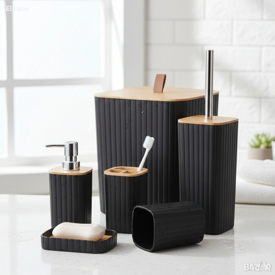 Тип продукт: комплект аксесоари за баня – 6 части; Диспенсър за течен сапун – 7.5 × 7.5 × 17.5 см; Чаша – 7.5 × 7.5 × 10.5 см; Поставка за четки за зъби – 7.5 × 7.5 × 11 см; Сапунерка – 12 × 8 × 3 см; Поставка за тоалетна четка – 9.8 × 9.8 × 33.5 см; Кошче за отпадъци – 21.8 × 19.6 × 24 см; Материал: устойчив материал, подходящ за влажни помещения; Поддръжка / почистване: лесно почистване с влажна кърпа; Приложение: подходящ за домашна баня, тоалетна или гостна баня.