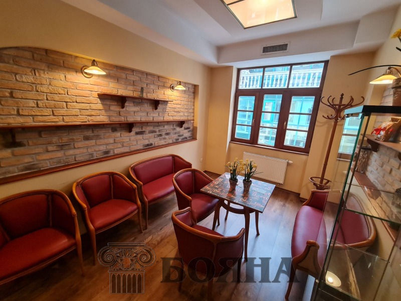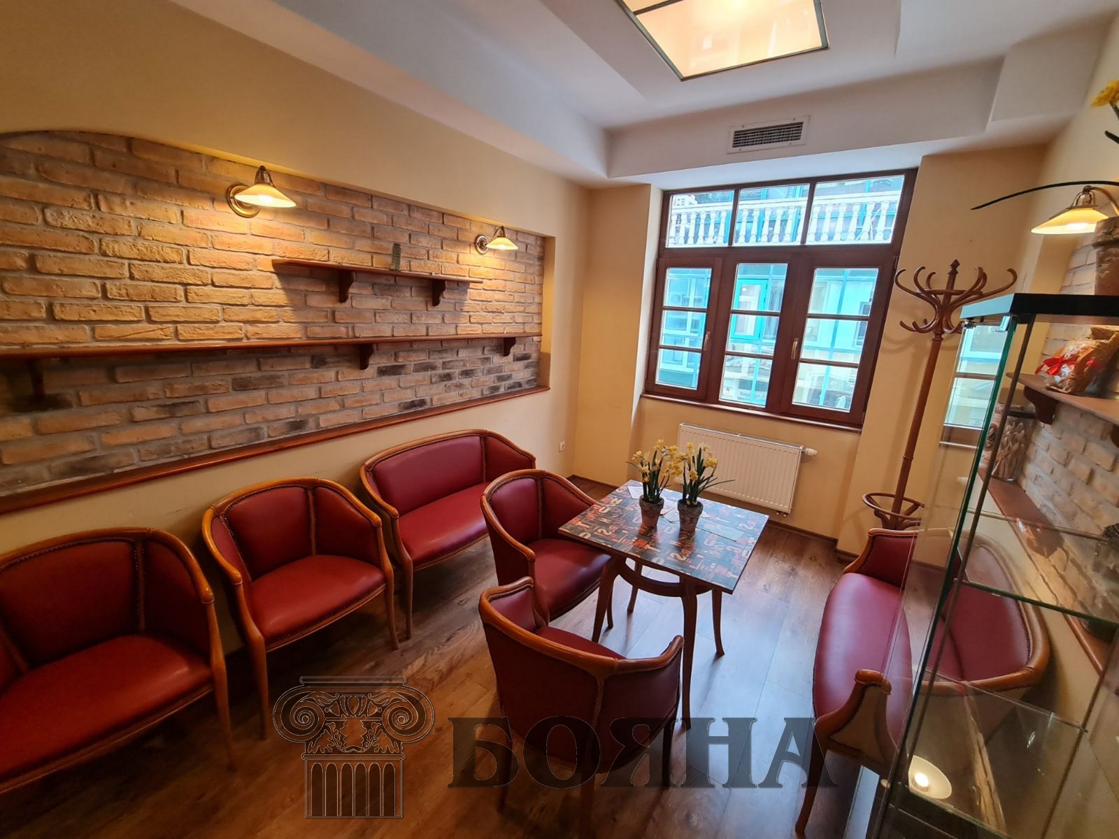 Имоти 'Бояна' предлага за продажба самостоятелен етаж от луксозна монолитна къща, разположена в идеалния център на град Русе, в близост до комплекс Евас и Общината. Бизнес помещението е с квадратура 130 кв.м- изключително просторно и светло, отлично поддържано и стилно обзаведено. Състои се от голямо помещение функционално преградено на две посредством параван, изграден бар, отделно офис помещение/ кабинет и две отделни санитарни помещения.
