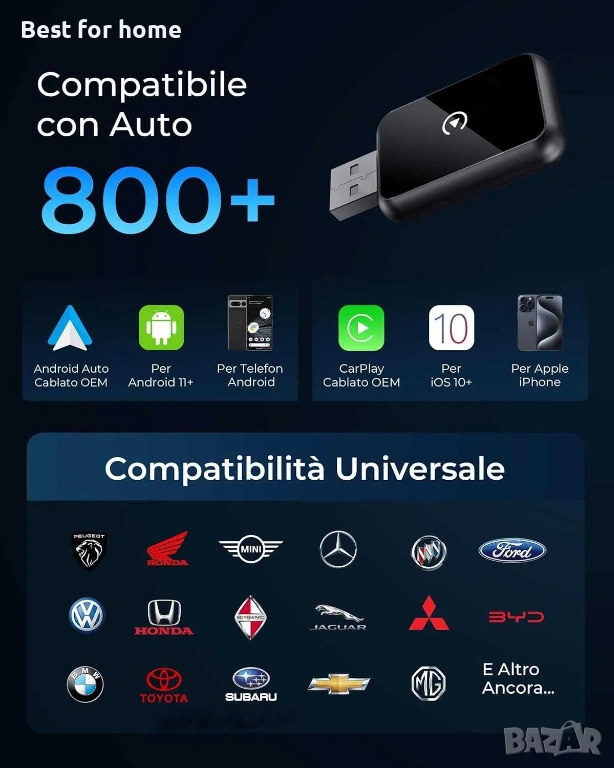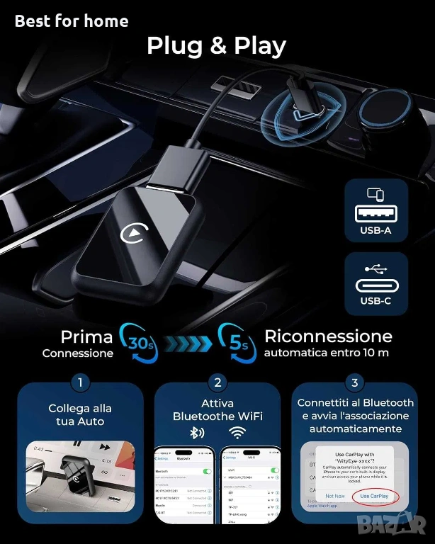 Автоматично свързване: След първоначалната бърза настройка, адаптерът се свързва автоматично с телефона ви чрез Bluetooth и WiFi всеки път, когато влезете в колата.