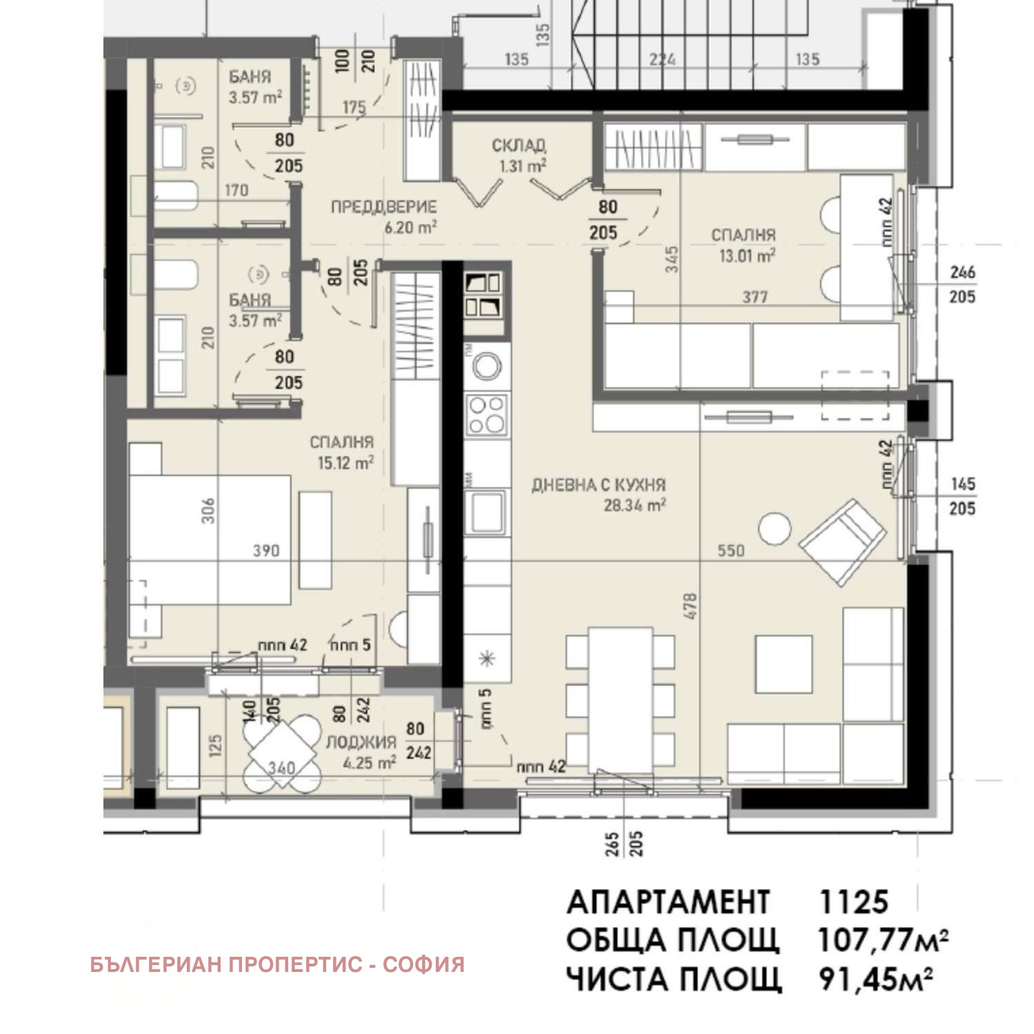 Апартамент A1125 , гледка към градина, обща площ 107.79 кв.м. (нетна площ 91.45 кв.м. + общи части 16.34 кв.м.).