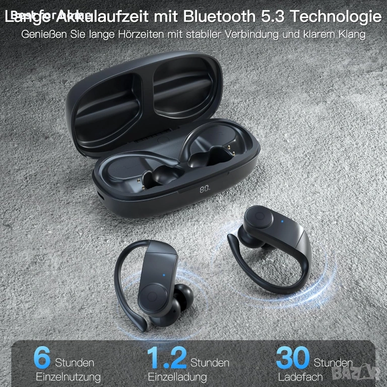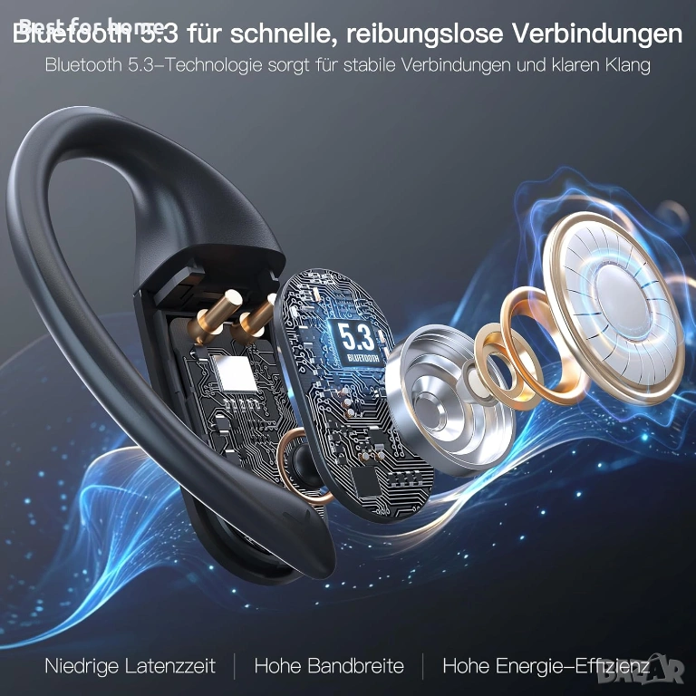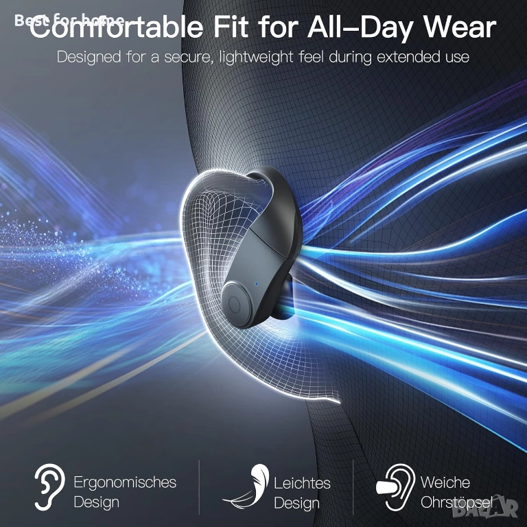 Open-Ear дизайн за комфорт и безопасност: Слушалките стоят стабилно зад ухото, осигурявайки естествен звук без да блокират слуха ви. Изключително хигиенични и удобни дори за хора с чувствителни уши.