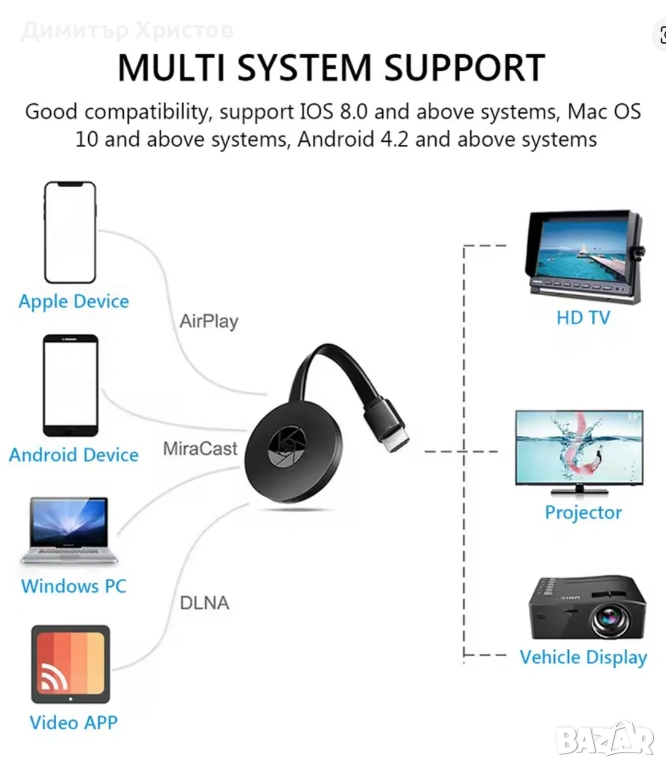 Режими на стрийминг: Поддържа AirPlay (за iOS устройства) и Miracast (за Android и Windows устройства).