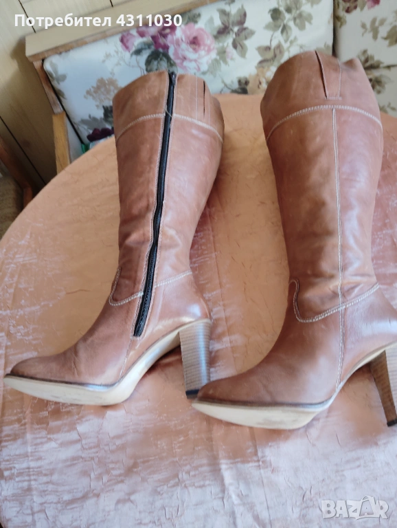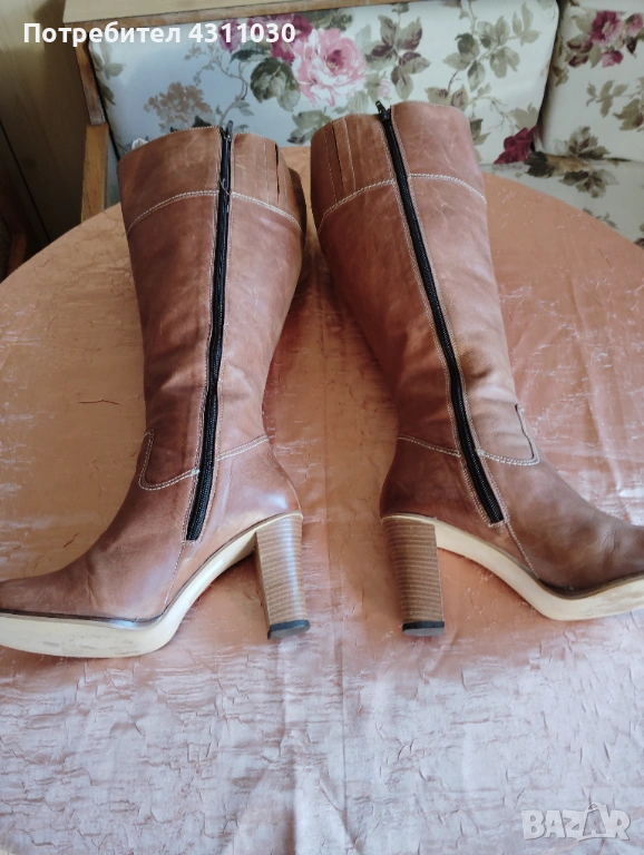 Дамски ботуши от естествена кожа за дама с широк прасец. Номерация 42. Ползвани веднъж .Височина на ботуша мерена от тока нагоре 40 см.ток 9 см.обиколката наи - отгоре е 51 см стелка 27 ,5