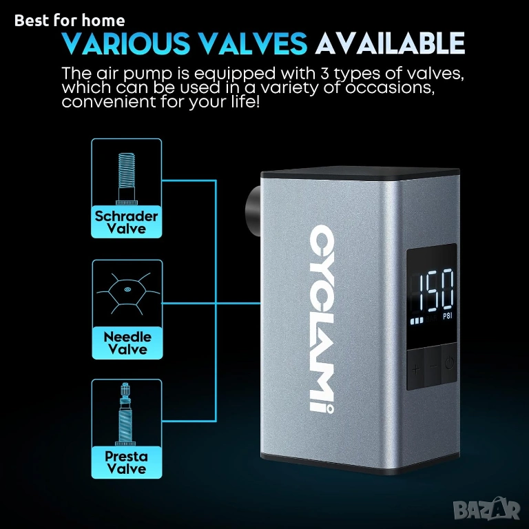 Универсален вентил: Съвместима с двата най-често срещани стандарта – Presta (френски) и Schrader (автомобилен), без нужда от допълнителни адаптери.