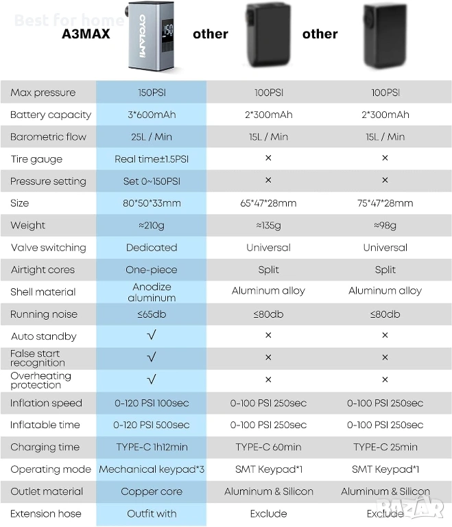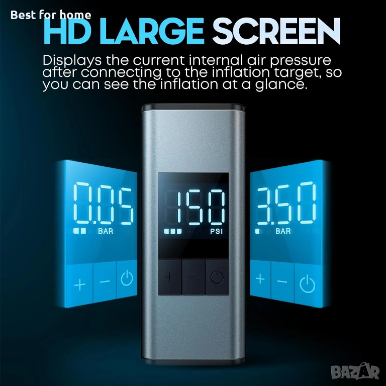 Презареждаема батерия: Вградена литиева батерия с бързо зареждане чрез USB-C. Може да напомпа няколко гуми с едно пълно зареждане.