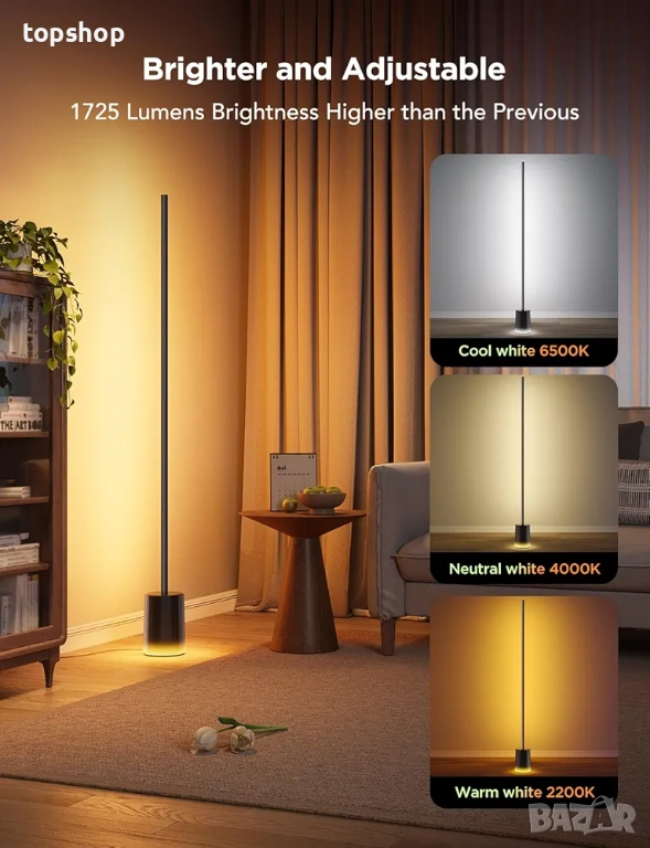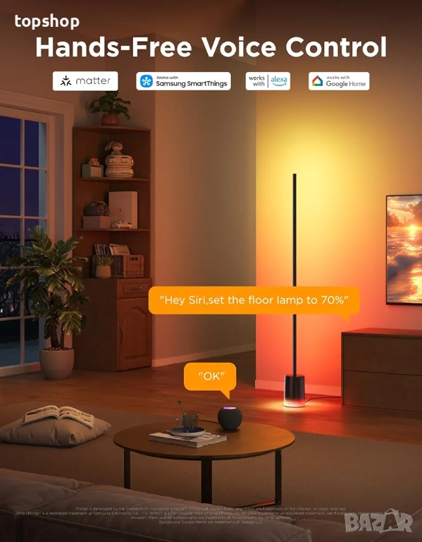 Интелигентно управление, поддържано от Matter-Supported: Тази модерна подова лампа предлага гласово управление и интелигентни възможности за затъмняване. Създайте без усилие уютна атмосфера и направете тази интелигентна подова лампа с възможност за включване и изключване, промяна на цвета, димиране на яркостта и реагиране на други гласови команди чрез HomeKit (изисква IPv6 мрежа), Alexa и Google Assistant.