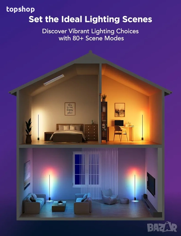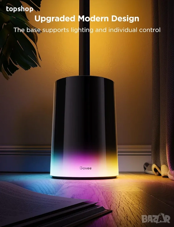 Опции за ярко осветление: С приложението Govee Home открийте различни опции за осветление с над 80 предварително зададени режима на сцена и персонализируеми от потребителя режими „Направи си сам“. Лесно променяйте атмосферата на пространството си с ефекти като Залез, Нощна светлина и Дъга чрез тази LED подова лампа.