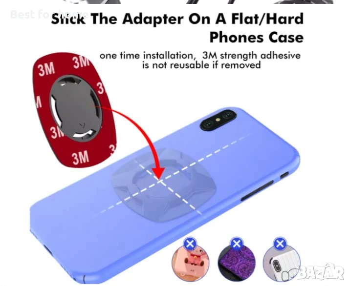 Универсален адаптер:Комплектът включва супер здраво лепящо се покритие (VHB на 3M), което се поставя върху гърба на вашия кейс и позволява мигновено поставяне и сваляне на стойката.